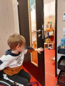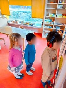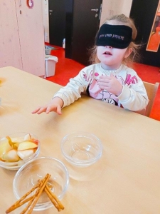 Unsere Erzieher*innen haben mit einer Maske den Sehsinn beeinträchtigt und undere Kita-Kinder durften sich führen lassen, blind verschiedenes Obst probieren und erraten, was es ist. Um den Hörsinn zu beeinträchtigen, wurden an einem anderen Tag Kopfhörer aufgesetzt und die Kinder mussten erraten, wer sprechend hinter ihnen steht. Im Alltag durften sie außerdem im Rollstuhl verschiedene Dinge ausprobieren, wie Hände zu waschen oder den Teller abzuräumen. Nach den Angeboten wurde mit den Kindern besprochen, wie es für sie war und wie Menschen mit Beeinträchtigung ihren Alltag meistern und oft genauso ein normales Leben führen können, wie Menschen ohne Beeinträchtigung.