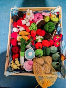 Besonders wollen wir uns an dieser Stelle bei der Oma einer pädagogischen Fachkraft bedanken, die in fantastischer Handarbeit kostenlos zahlreiche Lebensmittel für die Kinder gehäkelt hat. Vielen Dank!