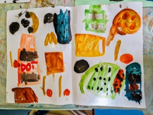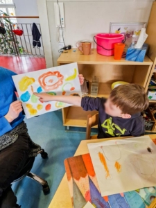 In der Ruhephase wurden unsere Kita-Kinder dann kreativ. Jedes Kind malte mit Wasserfarbe eigene Ideen zum Thema Essen und Trinken und stellte sein Bild anschließend der Gruppe vor. Dabei entstanden tolle Gespräche und ganz unterschiedliche Perspektiven.