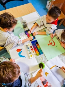 Aus diesem Interesse heraus ist unser Kreativangebot entstanden. Dabei werden Kompetenzen gefördert wie Feinmotorik und Hand-Augen-Koordination; Konzentration und Ausdauer; Kreativität; Sprache, Begriffe und Grundverständnis; Soziale Kompetenzen (Ideen teilen, gegenseitiges helfen) und Selbstwirksamkeit.