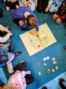 In einem weiteren Morgenkreis haben Groß und Klein gemeinsam einen Ernährungskreis erarbeitet. Die Kinder ordneten die Lebensmittel verschiedenen Bereichen zu, wie: