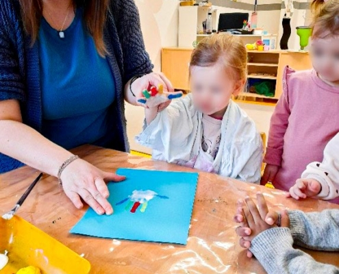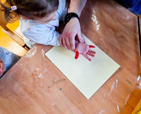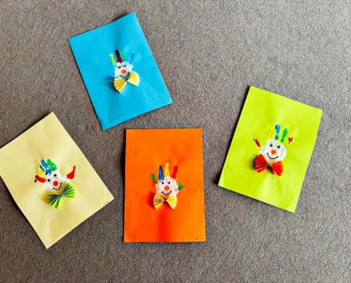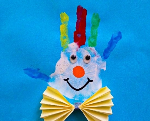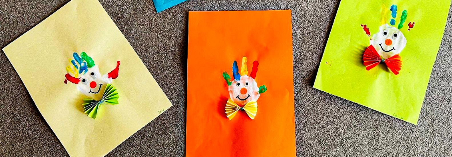 Um die Faschingszeit gebührend zu feiern, sind die Kinder und pädagogischen Fachkräfte fleißig kreativ geworden. Am Dienstag haben die großen den kleinen Künstlern geholfen, Clowns aus Handabdrücken zu machen. Mit großem Spaß haben sich die Kinder die Farben für die Haare ihrer Clowns ausgesucht. Die Ziele des Angebots waren die Förderung der Wahrnehmung, die Förderung der Sprachentwicklung und die Förderung der Konzentration. Am Ende sind eine Menge bunter und vielfältig-fröhlicher Clowns entstanden.