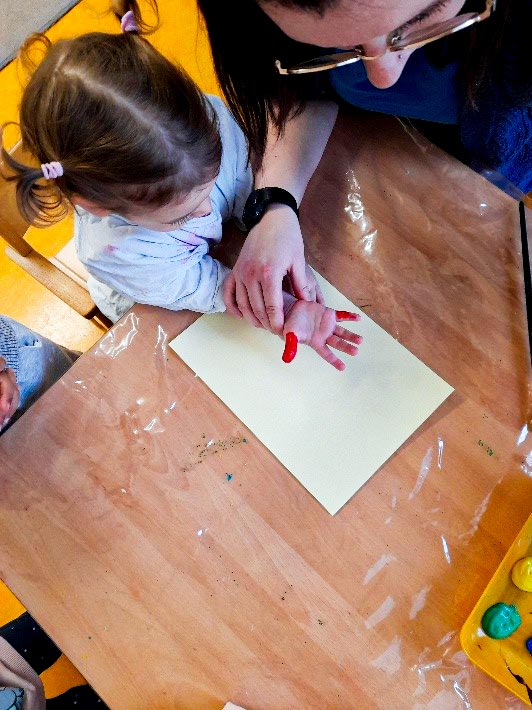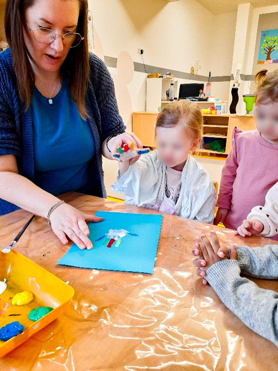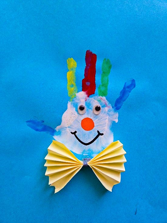 Um die Faschingszeit gebührend zu feiern, sind die Kinder und pädagogischen Fachkräfte fleißig kreativ geworden. Am Dienstag haben die großen den kleinen Künstlern geholfen, Clowns aus Handabdrücken zu machen. Mit großem Spaß haben sich die Kinder die Farben für die Haare ihrer Clowns ausgesucht. Die Ziele des Angebots waren die Förderung der Wahrnehmung, die Förderung der Sprachentwicklung und die Förderung der Konzentration. Am Ende sind eine Menge bunter und vielfältig-fröhlicher Clowns entstanden.