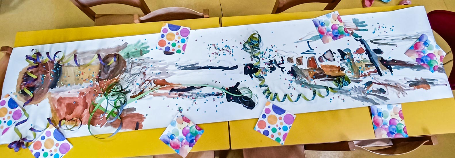 So haben die Kinder der Nilpferdgruppe aus Tonpapier bunte Clowns gebastelt. Die Leopardenkinder haben bunte Hüte und Luftballons gestaltet. In der Pinguingruppe wurde von den Kindern eine schöne bunte Tischdecke zum gemeinsamen Faschingsfrühstück hergestellt.