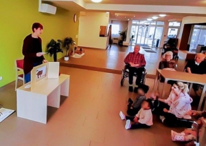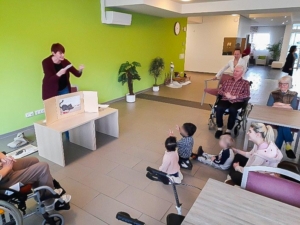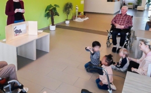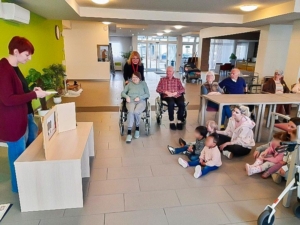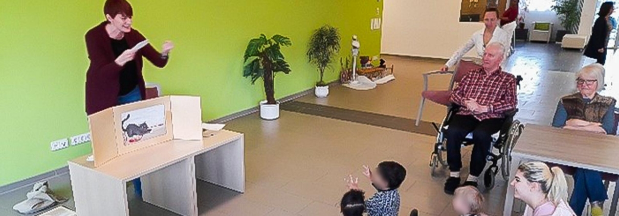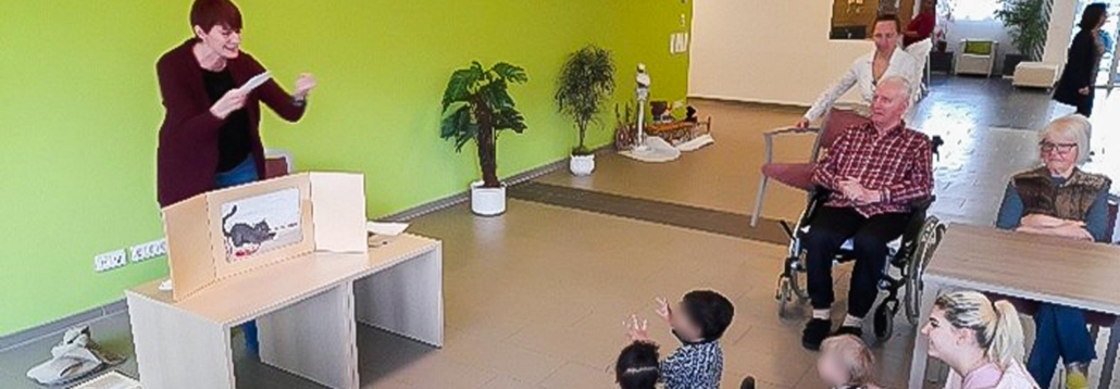 Gestern war die Mäusegruppe unserer Kita Kranichgarten im Seniorenheim und brachte eine Bildtheatergeschichte mit. Die Geschichte handelte vom Kater Kasimir, der einen spannenden roten Wollfaden entdeckt hatte, an dessen Ende sich etwas Schweres befand… Nachdem sich Kasimir erst verheddert hatte, von allen gemeinsam jedoch mit einem Zauberspruch befreit werden konnte, entdeckten unsere pädagogischen Fachkräfte, Kita-Kinder und Senior*innen mit Kasimir, was sich da Geheimnisvolles am Ende des Fadens befand.