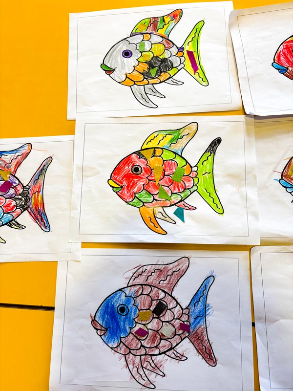 In der Leoparden-Gruppe fand in der Ruhephase eine Bilderbuchbetrachtung von „Der Regenbogenfisch“ statt. Dadurch wurde bei den Kindern das Interesse geweckt, ihre eigenen Bücher mitzubringen. Anschließend malten die Kinder ihren eigenen Regenbogenfisch. Das Angebot förderte nicht nur die Sprachentwicklung, indem es den Wortschatz erweiterte und die Kita-Kinder lehrte, zuzuhören. Auch wurden ihre Fantasien angeregt, die Empathie durch Wertevermittlung (zum Thema Teilen mit anderen) wurde gefördert, sowie die Gefühlsregulation, sich selbst in den Figuren wiederzuerkennen (z.B eigene Ängste oder Freude).