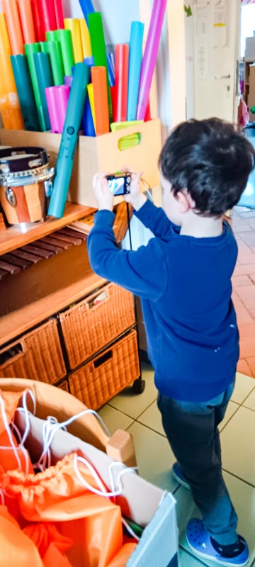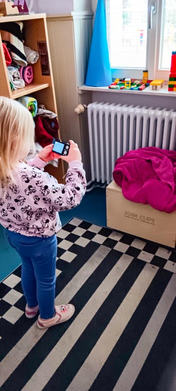Im Morgenkreis wurde schließlich die Fotokamera gezeigt und den Kita-Kindern wurden die Funktionen erklärt. Die Kinder wollten gerne Bilder mit Objekten ihrer Lieblingsfarbe machen. Mit seiner Lieblingsfarbe im Kopf durfte jedes Kind anschließend einzeln durch das Haus laufen und sich einen Gegenstand aussuchen, welchen es ablichten wollte.
