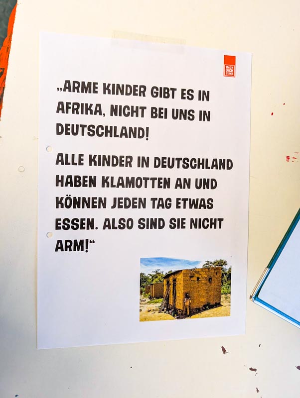 Um ein Zeichen zu setzen, haben auch unsere Offenen Kinder- und Jugendhäuser TREFF und RÖHRE an den Aktionstagen teilgenommen und unter anderem die Plakat-Aktion „Du auch? Mit Kinderrechten Zukunft gestalten!“ umgesetzt. Sie lud ein, sich kreativ mit Kinderrechten auseinanderzusetzen und gute Gründe zu finden, warum alle Kinder die gleichen Chancen verdienen. Damit informierten sie die Besucher*innen über die Hintergründe von Kinderarmut.