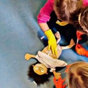 Im Anschluss durfte jedes Kind Einmal-Handschuhe anziehen und Erwin, die Stoffpuppe, mit einem Pflaster am Körper versorgen. Außerdem lernten unsere Kita-Kinder anhand einer Eselsbrücke, „1-1-2, Hilfe kommt herbei“. Es wurden Verbände ausgeteilt, mit denen sich immer zwei Kinder gegenseitig verbinden konnten. Ganz mutige Kinder benutzten Kunstblut, um geschminkte Wunden echter wirken zu lassen.